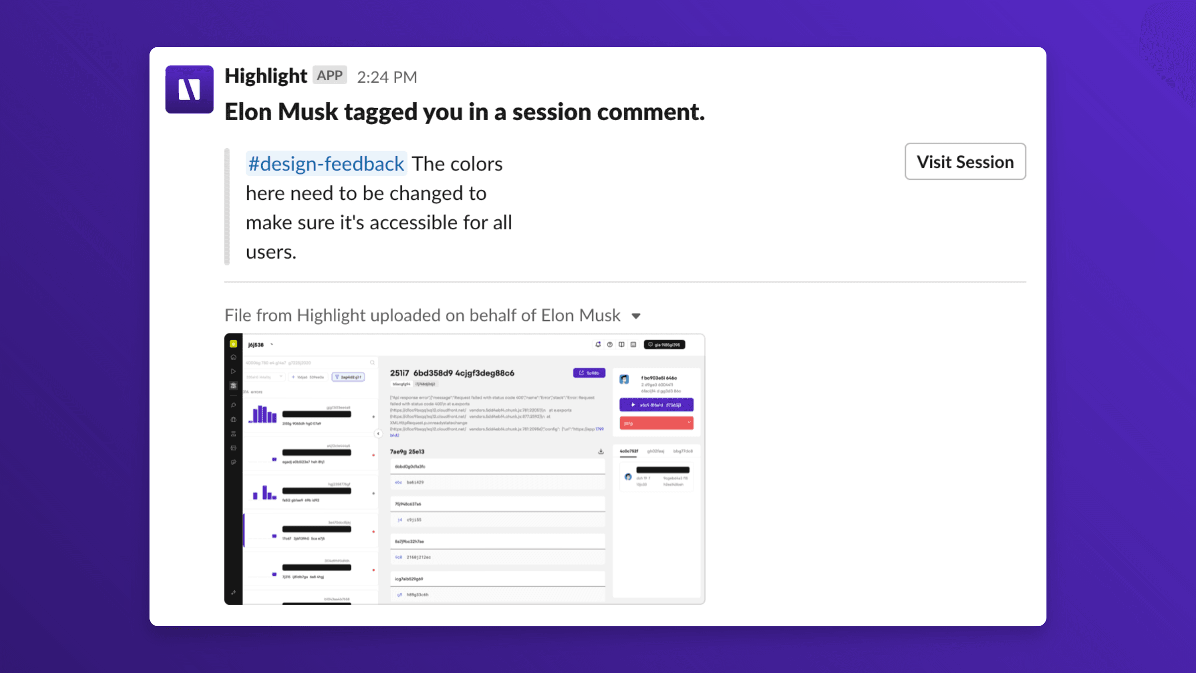 If you tag your team when creating a comment (learn more Slack Integration), Highlight will send them a message via email or Slack. Those messages will contain your comment text and a screenshot of the session at the current time.